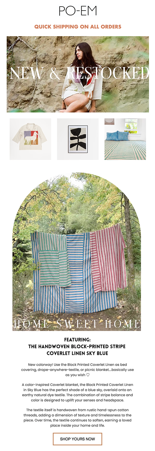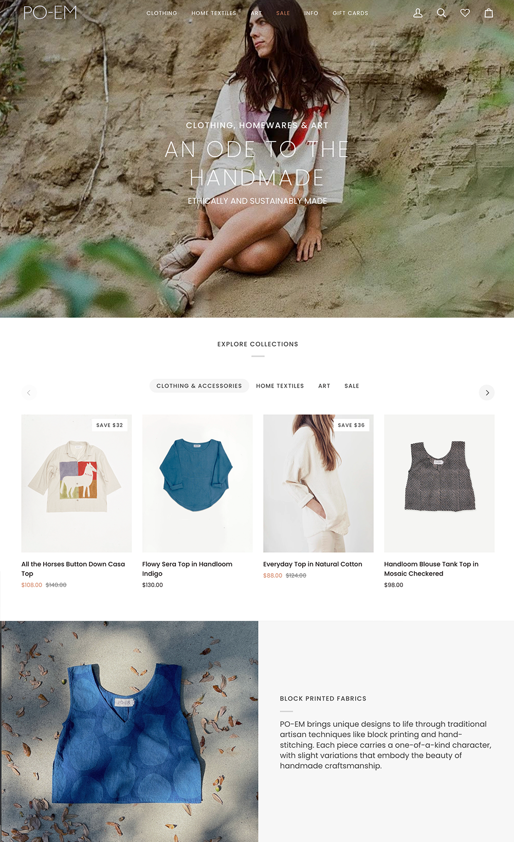 PO-EM is a line of unique, distinctive pieces for wardrobe and home. Each piece is carefully crafted with mindfulness toward both humanity and the earth, using eco-friendly processes and natural materials, reflecting the joy in utility, the magic of the natural world, and the enduring allure of ancient processes and artistry.